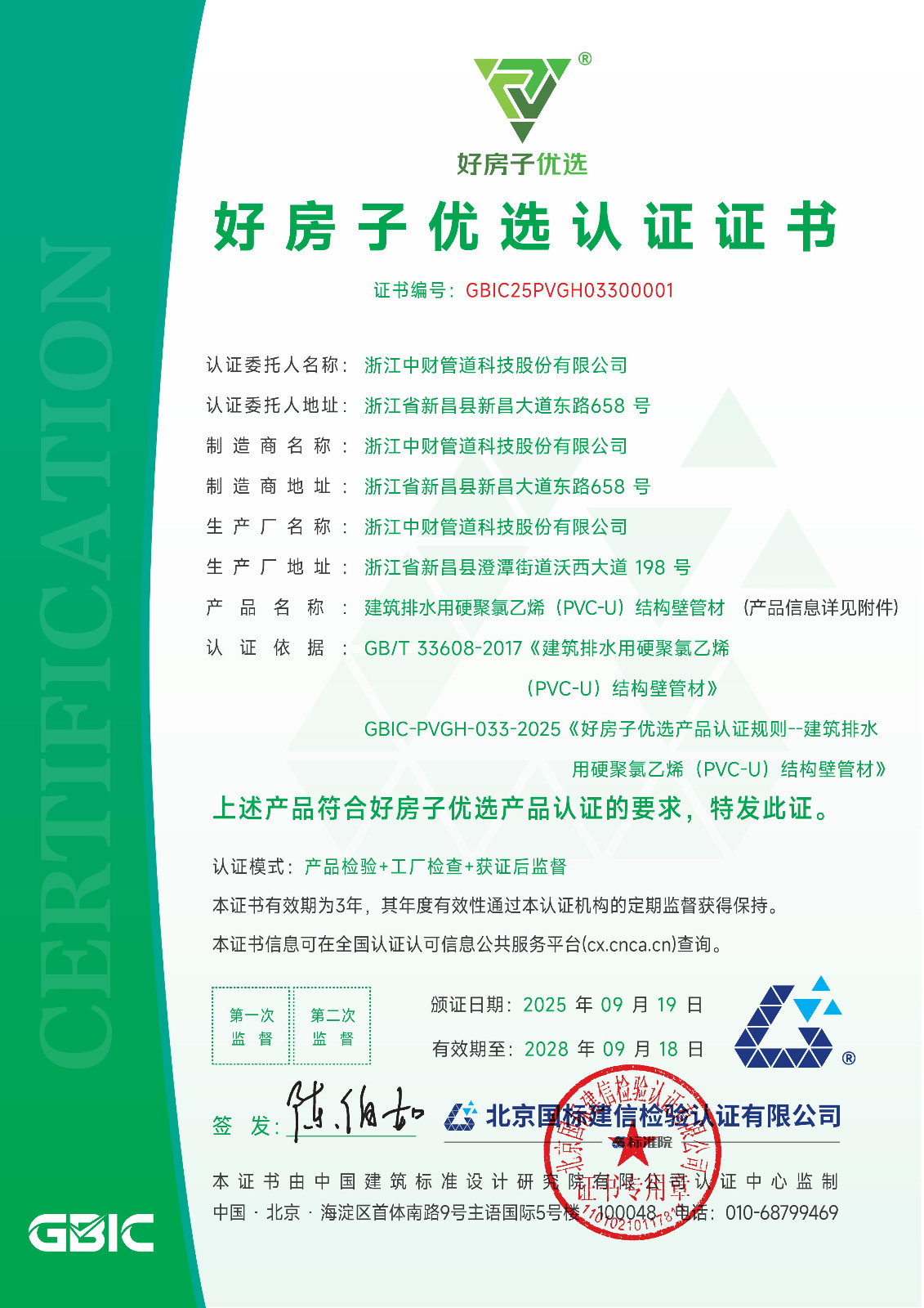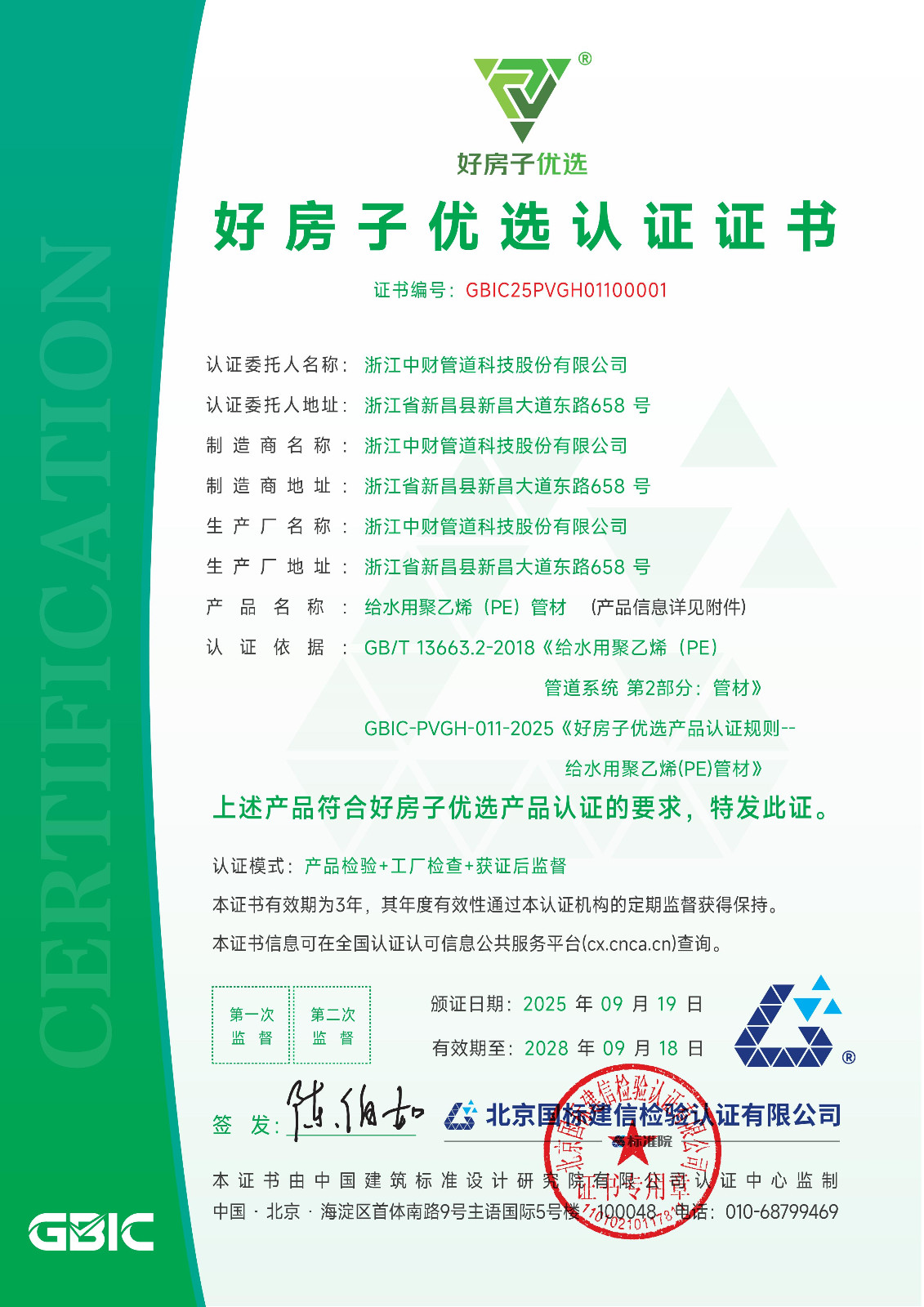 经评定,我公司生产的“中财牌”PVC排水管材件、电工套管、CTS同层排水、HDPE静音管、PPR管、PERT、钢丝网复合管、竹木纤维集成墙面等20个产品,满足“好房子优选”产品认证要求,并于2025年9月19日颁发认证证书。所有证书编号均为00001,该证书是管道行业首张“好房子优选”认证证书。